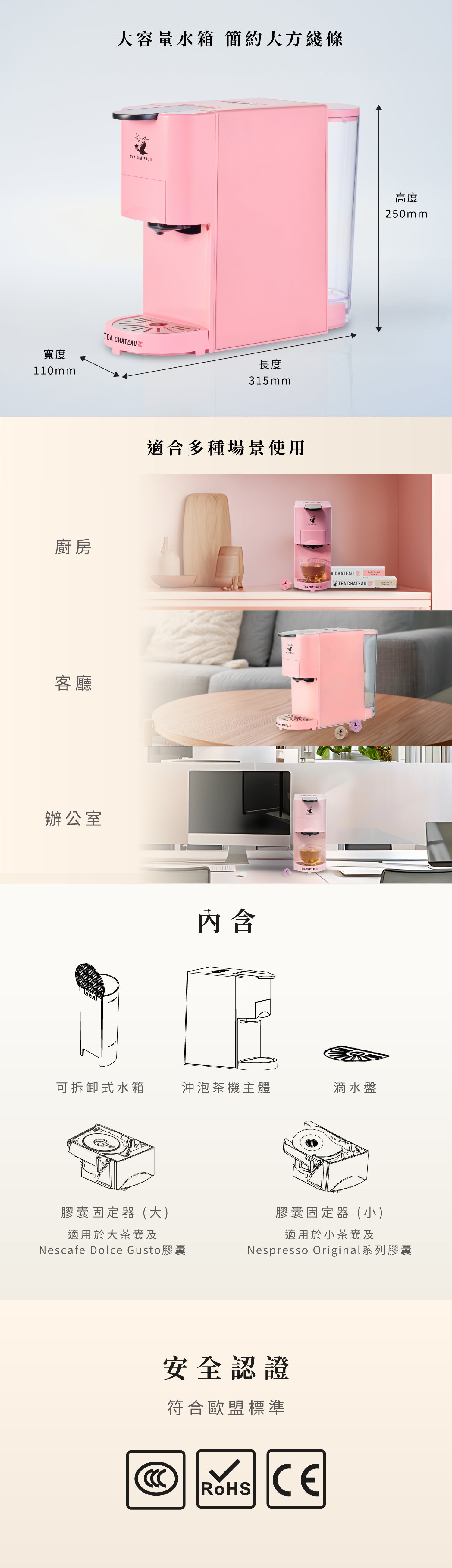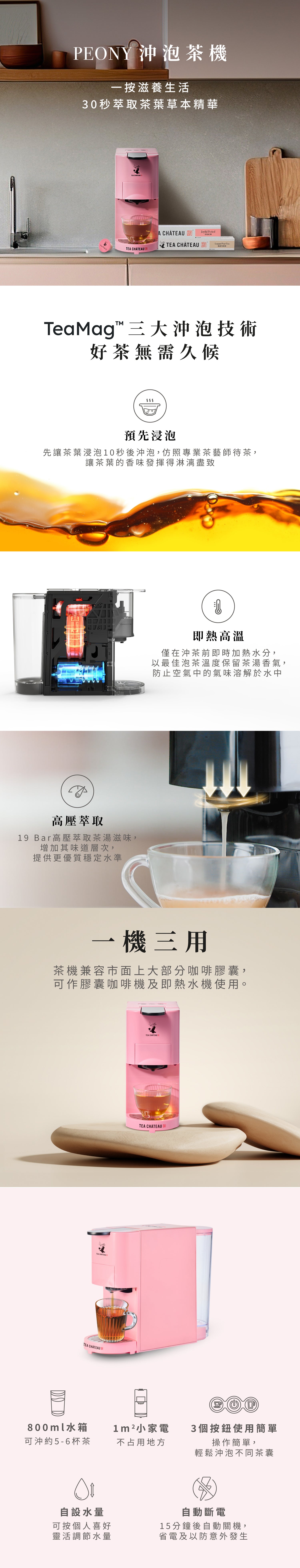 The Modern Tea Capsule Machine elevates every tea experience to a whole new level with its revolutionary 19-bar pressure extraction, high temperature and pre-soaking processes. Simply place our tea capsules into the machine, and an exceptional cup of tea prepared with precise water volume and temperature settings will be delivered to you in seconds. Modern is also fitted with an 800ml water reservoir to satisfy your everyday needs.